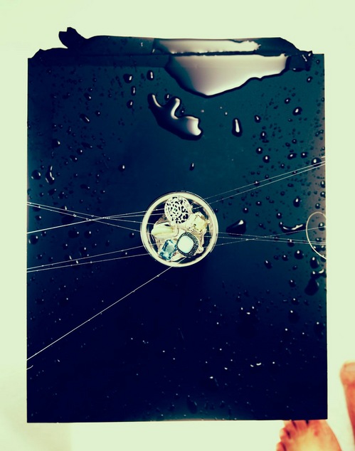 Norimichi Inoguchiの作品、"Untitled"の製作過程。グラスから飛び出るジュエリーは何本ものテグスで固定された上で、一瞬の水の動きをとらえ撮影された。
